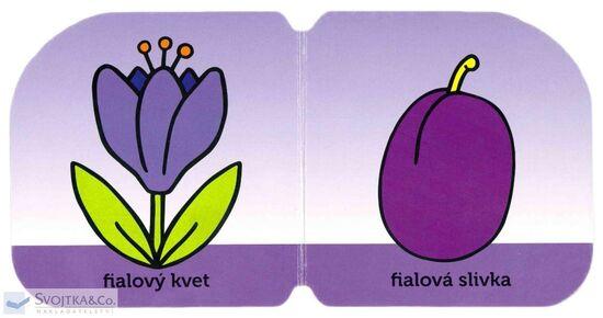Hasičské auto a jahoda sú červené, lev a banán sú žlté, policajné auto a báger majú modrú farbu, chrobáčik a hruška majú zelenú farbu, pomaranč a rybka majú oranžovú farbu, suknička a plameniak majú ružovú farbu, kytička a slivka sú fialové, tuleň a hroch sú siví, mráčik a snehuliak sú bieli, ...