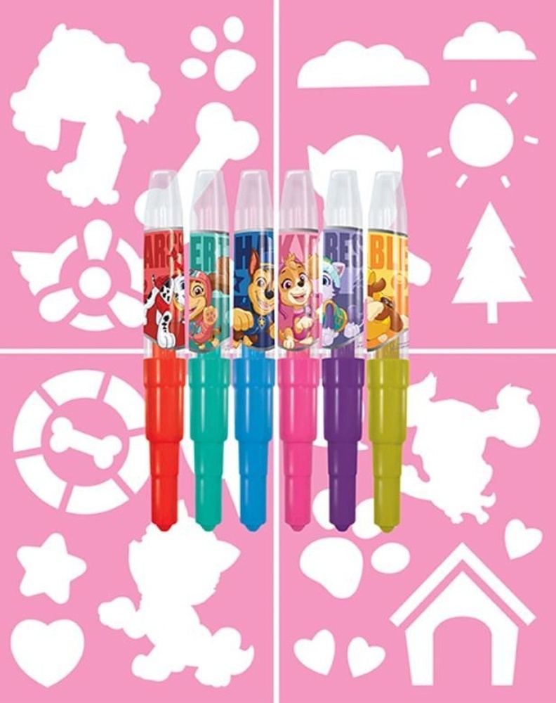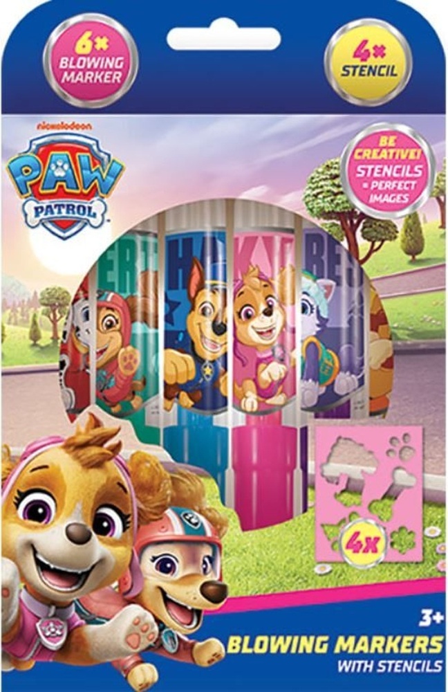 Balení obsahuje 6 barevných foukacích fixů s potiskem a 4 barevné papírové šablonky v oblíbených motivech.