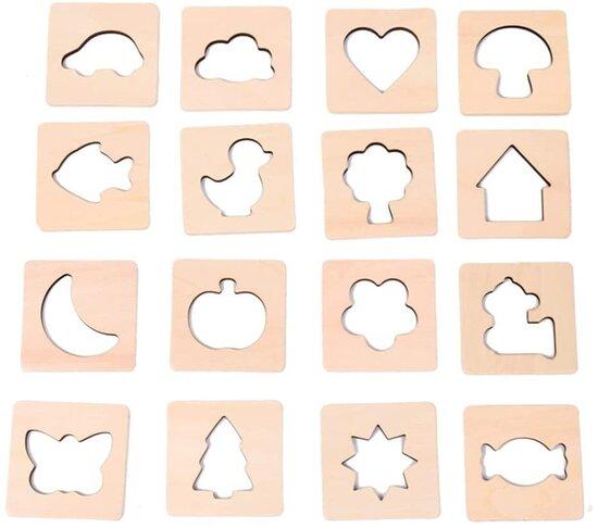 16 rámečků z přírodního dřeva (5,9 x 5,9 cm) a 16 barevných vyřezávaných obrázků,