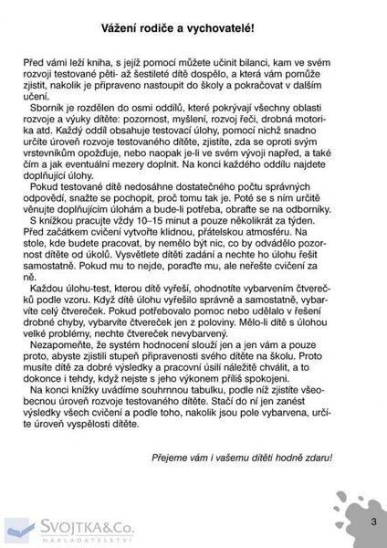 Nejkompletnější sborník testovacích úloh pro předškoláky, který připravili zkušení pedagogičtí pracovníci a psychologové. Prostřednictvím těchto testů snadno zjistíte úroveň rozvoje svého dítěte. Navíc můžete provést shrnutí všeho, čemu se vaše pěti- až šestileté dítě doposud naučilo, a připravit je na následující etapu, v níž je čekají složitější úlohy. Pokud testované dítě nezodpovědělo správně dostatečný počet úloh, nebuďte znepokojeni nebo rozladěni. Ke zlepšení obvykle postačí, budete-li dítěti trpělivě věnovat čas při řešení doplňujících úkolů, které jsou uvedeny na konci této knihy.