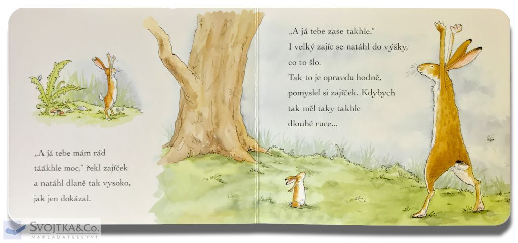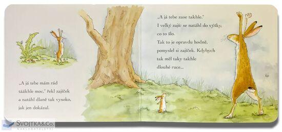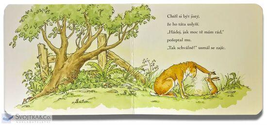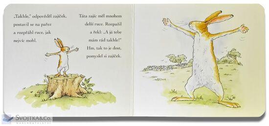 Zajíček měl už dávno spát. Ale zatím měl pořád oči otevřené a držel se tatínkových dlouhých uší. „Hádej, jak tě mám rád,“ pošeptal mu. „Tak schválně!“ usmál se zajíc… Představte si, že máte někoho rádi moc a moc rádi! a chcete mu to říct. Jak to nejlíp udělat? Není to snadné. Jak to šlo zajíčkovi s jeho tátou, se dozvíte v této krásně ilustrované knížce pro nejmenší děti, která je nejen hezkým příběhem, ale děti i ledacos naučí.