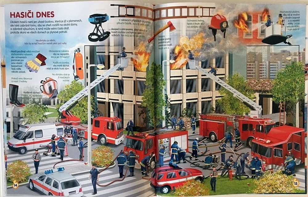 Na detailních obrázcích budou děti hledat ukryté předměty, čímž si nenásilně procvičí postřeh, trpělivost i soustředění – ideální pro předškoláky i malé školáky. A zatímco pátrají po drobnostech, postupně poznávají dějiny požární ochrany, první hasičské vozy i moderní techniku. Dozvědí se, jak funguje hasičské mužstvo, jak probíhá příprava k zásahům a jak vypadají různé záchranné akce – na moři, v horách, u dopravních nehod i při přírodních katastrofách. Nahlédnou také do světa lesních požárů a zjistí, jak náročná, důležitá a je práce hasičů.