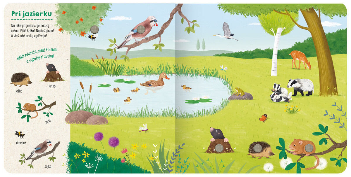 Vitaj vo svete zvierat. Poznáš jelenča? Vieš, ako robí lev? A ako prasa? Hľadaj a spoznávaj zvieratá v tejto zvukovej knihe s pevnými stránkami v rôznych prostrediach. Nájdi zvieratá, stlač tlačidlo a vypočuj si zvuk, aký vydávajú. Táto roztomilo ilustrovaná kniha predstaví deťom zvieratá v ich prirodzenom prostredí a naučí ich rozpoznávať podľa zvukov.