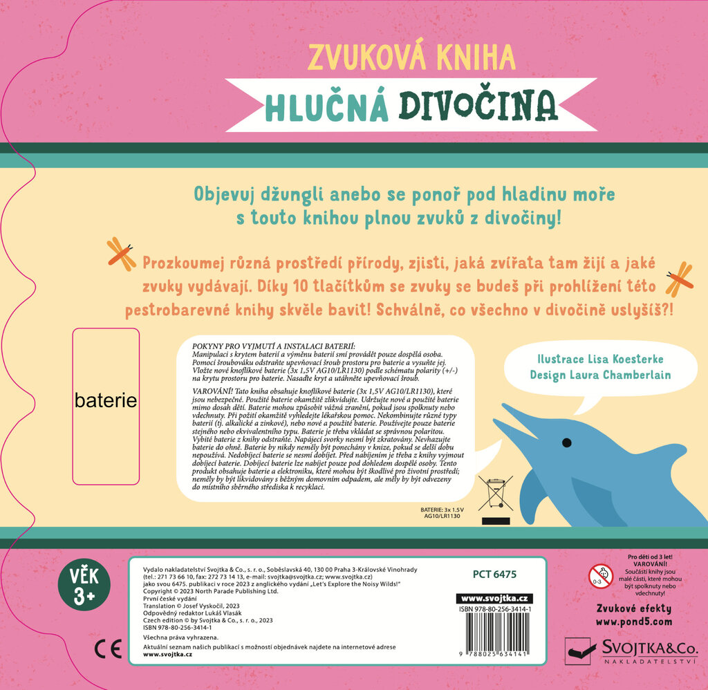 Objevuj džungli anebo se ponoř pod hladinu moře s touto knihou plnou zvuků z divočiny! Prozkoumej různá prostředí přírody, zjisti, jaká zvířata tam žijí a jaké zvuky vydávají. Díky 10 tlačítkům se zvuky se budeš při prohlížení této pestrobarevné knihy skvěle bavit! Schválně, co všechno v divočině ...