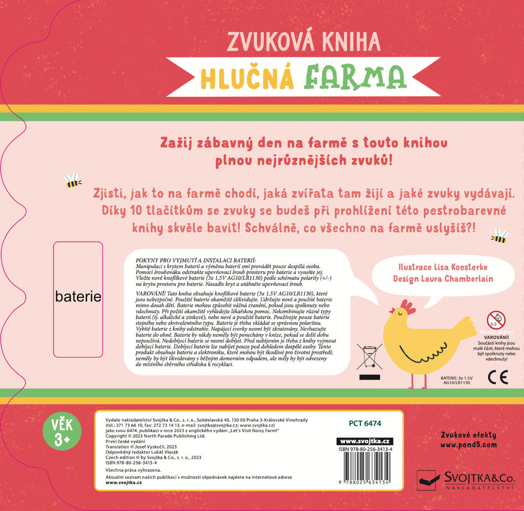 Zažij zábavný den na farmě s touto knihou plnou nejrůznějších zvuků! Zjisti, jak to na farmě chodí, jaká zvířata tam žijí a jaké zvuky vydávají. Díky 10 tlačítkům se zvuky se budeš při prohlížení této pestrobarevné knihy skvěle bavit! Schválně, co všechno na farmě uslyšíš?!