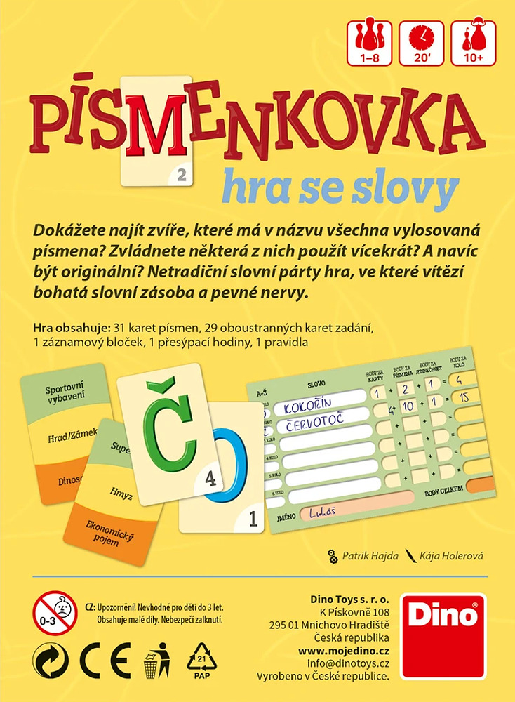 Dokážete najít zvíře, které má v názvu všech šest vylosovaných písmen? Zvládnete některá z nich použít vícekrát? A navíc být originální? Netradiční slovní hra, ve které vítězí pevné nervy a bohatá slovní zásoba. Rozvíjí jazykové schopnosti, trénuje slovní zásobu, postřeh, kreativitu i soutěžního ...