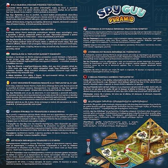 Spy Guy Pyramída je kooperativní postřehová hra, která vyžaduje bystré oko a úzkou spolupráci mezi hráči! Tato verze hry obsahuje prostornou desku plnou pohyblivých prvků, které dále zpestřují hru! Účastníci si procvičí své kooperativní a pozorovací schopnosti.