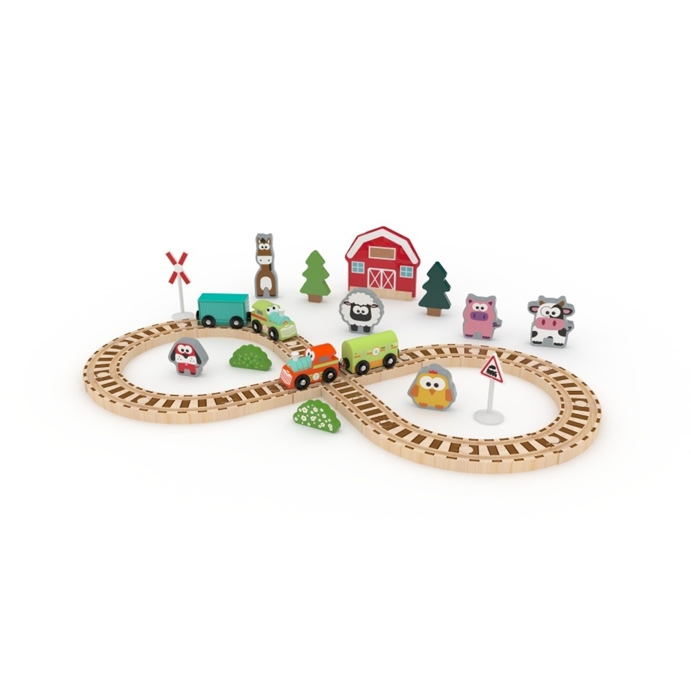 J`adore je řada vzdělávacích hraček pro nejmenší, vyrobených z ekologicky udržitelného dřeva, bez chemikálií. Produkt stimuluje dětskou fantazii. Set je vhodný pro děti od 3 let. Set obsahuje koleje, vláček, figurky zvířátka, domeček a stromy.