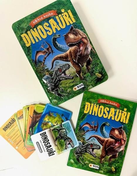 Dárkový set "Dinosauři" s knihu a karetní hru v nádherné plechové krabici s reliéfy dinosaurů!