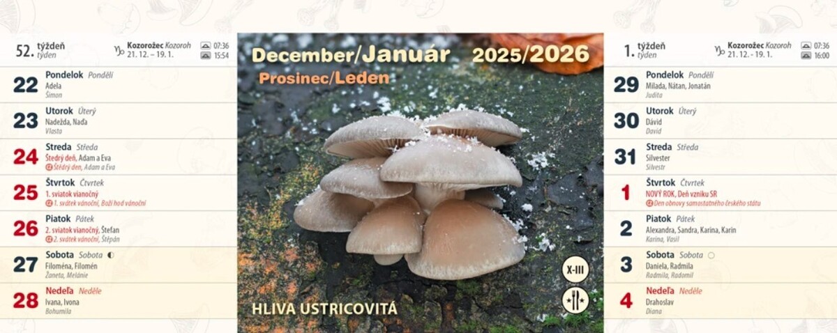 Úžasný hubársky stolový kalendár vám predstaví krásne hubárske úlovky zo slovenských lesov a lúk aj s názvom huby, piktogramom - jedlá, nejedlá, jedovatá huba a časom výskytu. Nájdete v ňom informácie o východe a západe Slnka, znamenia zverokruhu, slovenské a české mená a sviatky oboch krajín.