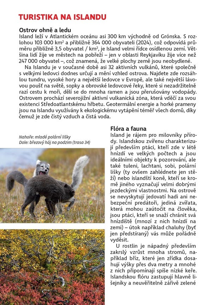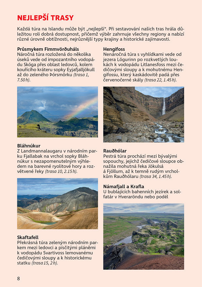 . Autoři Gabriele a Christian Handlovi vás nejprve blíže seznámí s ostrovem, připojí několik užitečných turistických rad a poté vás provedou islandskou krajinou, která zaručuje nezapomenutelné zážitky, ale zároveň klade mimořádné nároky na turisty – orientace v terénu bez značených stezek může být náročná, turistické chaty jsou vzácností a počasí může být nepředvídatelné. Všech 66 tras zahrnuje informace o možnostech ubytování a občerstvení, upozornění na případné překážky a také tipy, jak se na danou túru co nejlépe připravit.