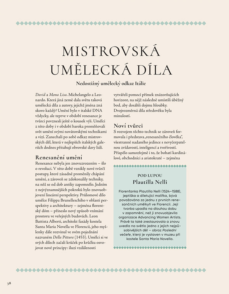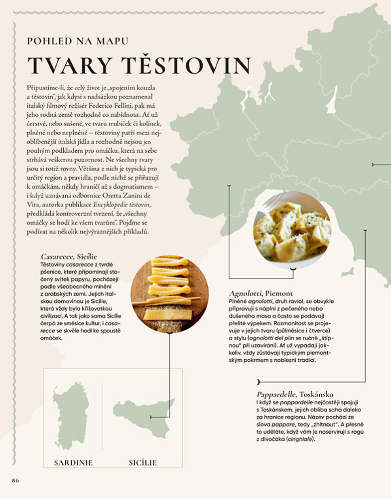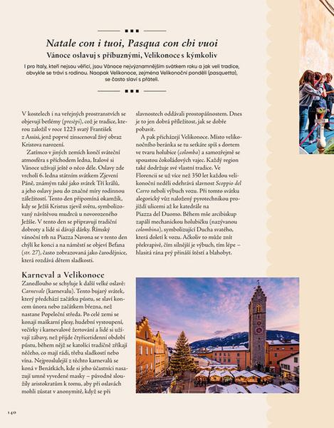 Kniha vám představí ikonické památky UNESCO, renesanční díla i antické ruiny, ale také vás zavede do stínu sicilských sopek, mezi vinice Piemontu či na horské stezky Dolomit. Odhalí, jak vznikla pizza nebo proč Italové milují piazzu, ukáže, co znamená „la dolce vita“ v každodenním životě, od italského rodinného stolu se dostanete až na přehlídková mola v Miláně. Přiblíží velikány, jako jsou Dante, Caravaggio či Fellini, ale i řemeslnou dokonalost italských krejčích, designérů nebo vinařů.