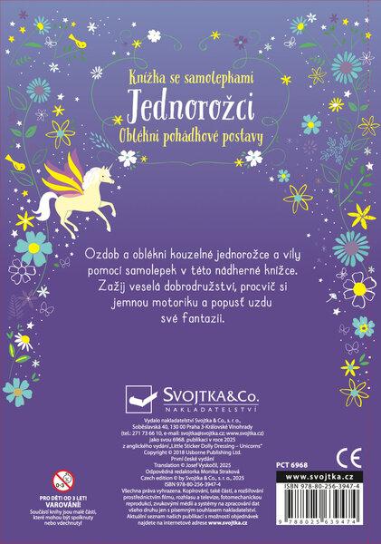 Pomocí samolepek ozdob a oblékni kouzelné jednorožce a víly v této nádherně ilustrované knížce. Jednorožcům a vílám dolepuj květinové věnce, křídla či slušivé sukýnky a dokonči zajímavé scenérie. Pokud se ti nepodaří umístit samolepku přesně na své místo, nezoufej, můžeš ji přelepit a umístit znovu. Samolepky můžeš nalepit do předem vybraných scenérií na konkrétní místo, nebo je nalepit podle vlastní fantazie, kam jen budeš chtít. Užij si s kouzelnými postavičkami zábavu, procvič si jemnou motoriku a představivost, které se meze rozhodně nekladou.