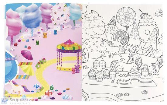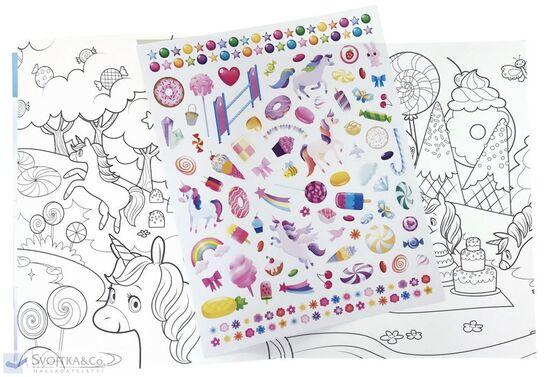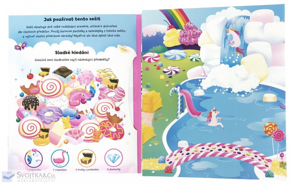 Vítej v neodolatelné zemi sladkostí, která je plná kouzelných jednorožců, duhových laskomin a květin. Více než 300 samolepek a přes 60 pěnových nálepek najdeš v této knížce se dvěma rozkládacími scenériemi. Popusť uzdu fantazii a kreativitě a nech tuto sladkou zemi ožít! Veselí jednorožci, roztomilá zvířátka a duhové květiny na tebe čekají na všech samolepkách. Nalep je, vybarvi a hraj si!