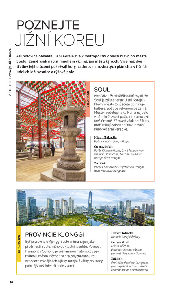 Jižní Korea si v posledních letech získala pozornost celého světa především díky raketovému vzestupu korejské popkultury: K-pop, K-drama a špičková technika, ale i muzea, tradice, královské paláce a bezpočet přírodních lákadel – nechte se inspirovat a navštivte všechny známé i ukryté poklady země. Ať už vás k cestě láká cokoliv, tento průvodce vám bude skvělým společníkem. Podrobné popisy, poutavé fotografie, prostorové kresby památek, praktické mapy i řada tipů vám pomůže k sestavení perfektního itineráře, pokud se vám zrovna nebudou hodit ty, které nabízí náš průvodce.