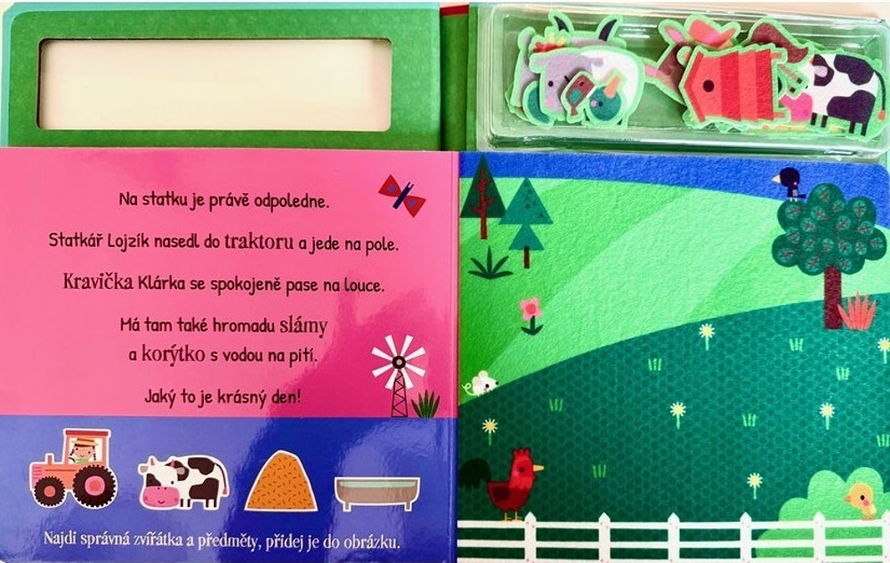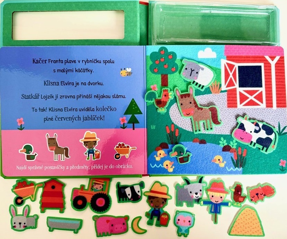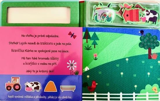 Tato hravá knížka nabízí pět zábavných scén s plstěnými deskami a 20 plstěnými samolepkami, které lze opakovaně skládat a přemisťovat. Děti si mohou sestavit vlastní scénky se zvířátky, kolečky, statkářem Lojzíkem, traktorem a dalšími zvířátky i věcmi ze statku.