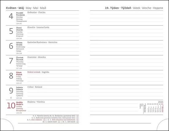 Formát diáře: 90 x 140 mm Rozsah diáře: 128 stran Kalendárium: týdenní kapesní + poutko na propisku