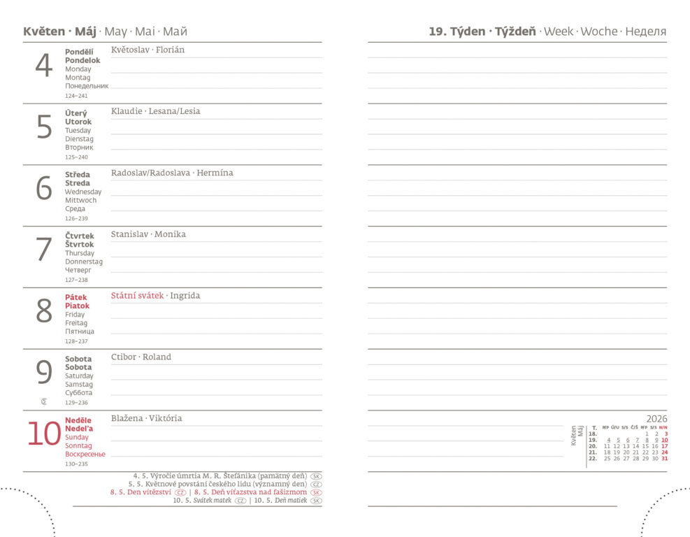 Formát diáře: 90 x 140 mm Rozsah diáře: 128 stran Kalendárium: týdenní kapesní