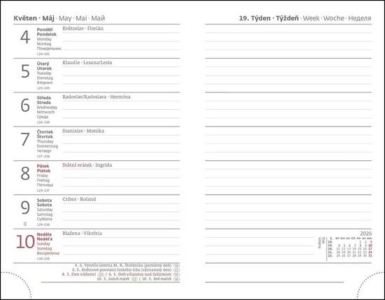 Formát diáře: 90 x 140 mm Rozsah diáře: 128 stran Kalendárium: týdenní kapesní