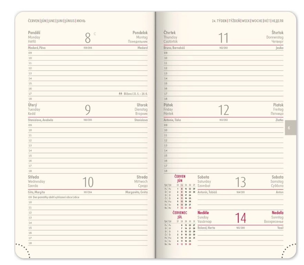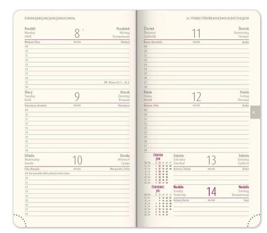 Nová, cenově dostupná řada diářů s obálkou z ekologického papíru spojuje styl a udržitelnost. Týdenní rozložení s česko-slovenským kalendáriem a doplňkovou angličtinou, němčinou, maďarštinou a ruštinou.