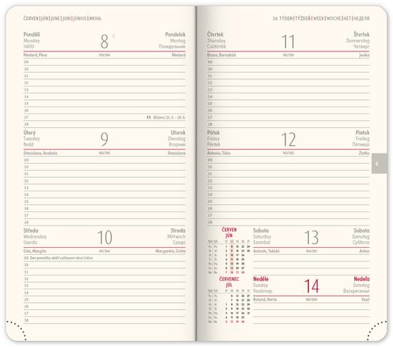 Nová řada diářů v moderním designu doplněném o pevnou gumičku a poutko na pero. Týdenní rozložení s česko-slovenským kalendáriem a doplňkovou angličtinou, němčinou, maďarštinou a ruštinou.
