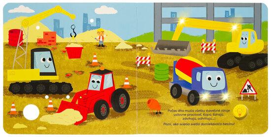 Počas dňa musia všetky stavebné stroje usilovne pracovať. No čo sa deje v noci? Naozaj všetky stroje spia? Otvorte túto knihu so svetielkami a zistite to so svojimi najmenšími! Stlačte tlačidlo a rozsvieťte svetlá žeriava, bagra aj hviezdičky na oblohe.