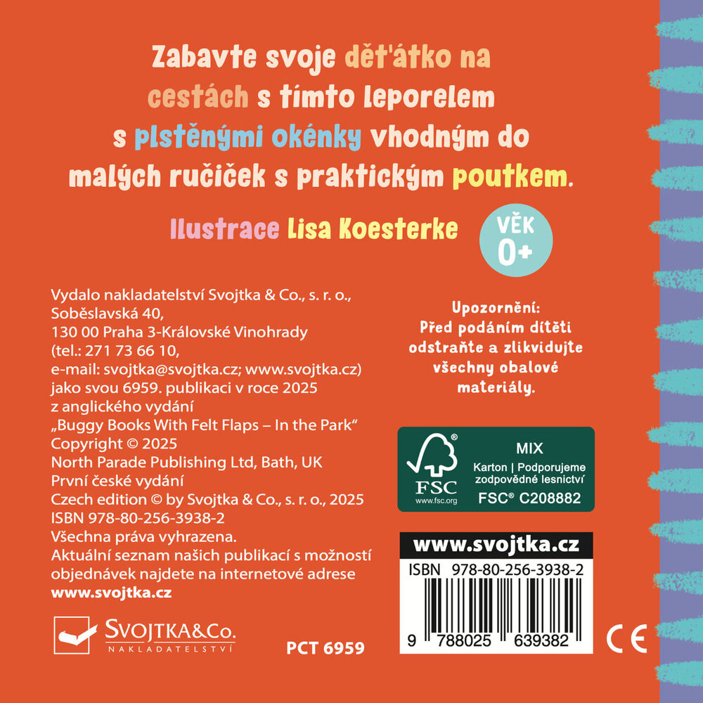Tato menší knížka s plstěnými okénky zaujme nejmenší děti. Díky vhodné velikosti a měkkým okénkům leporelo napomůže s rozvojem zraku, hmatu i motorických schopností. Děti se seznámí se zvířátky, které mohou potkat na procházce, a praktické poutko zajistí, že knížečka bude miminku vždy po ručce.