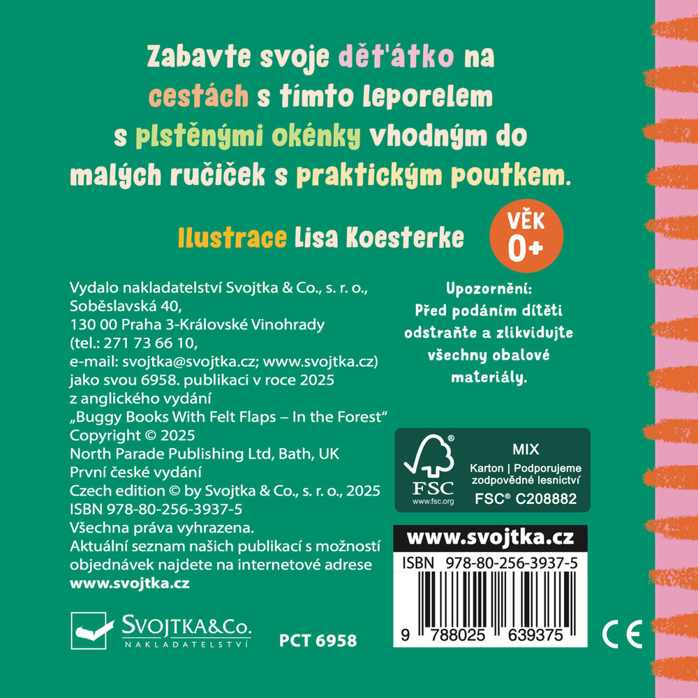 Tato menší knížka s plstěnými okénky zaujme nejmenší děti. Díky vhodné velikosti a měkkým okénkům leporelo napomůže s rozvojem zraku, hmatu i motorických schopností. Děti se seznámí se zvířátky v lese a praktické poutko zajistí, že knížečka bude miminku vždy po ručce.
