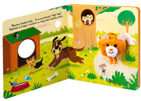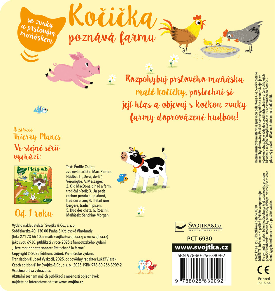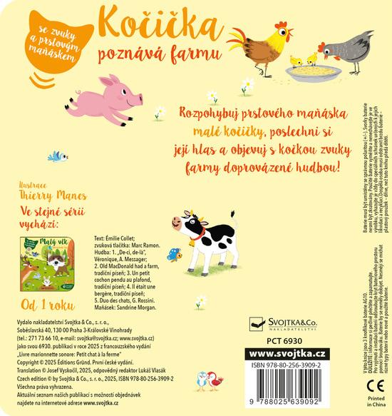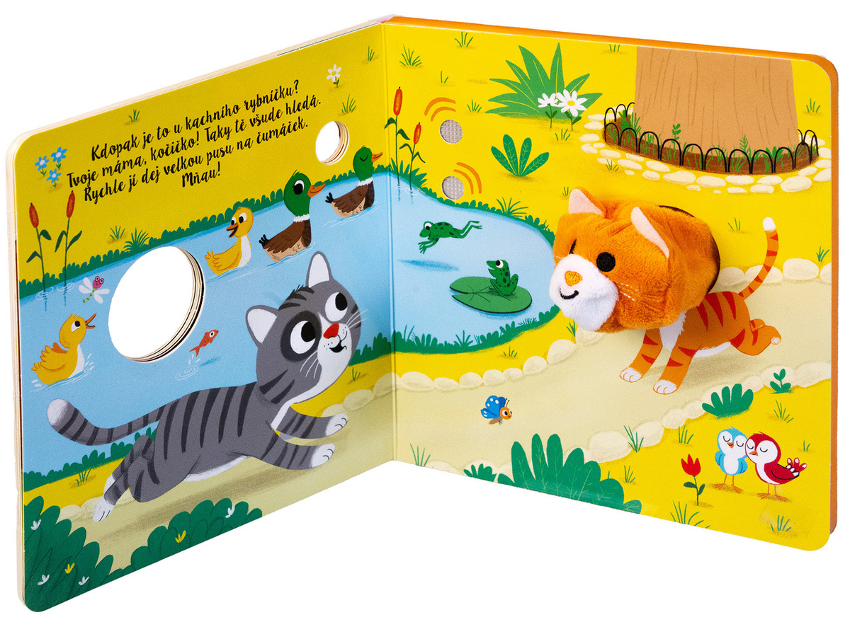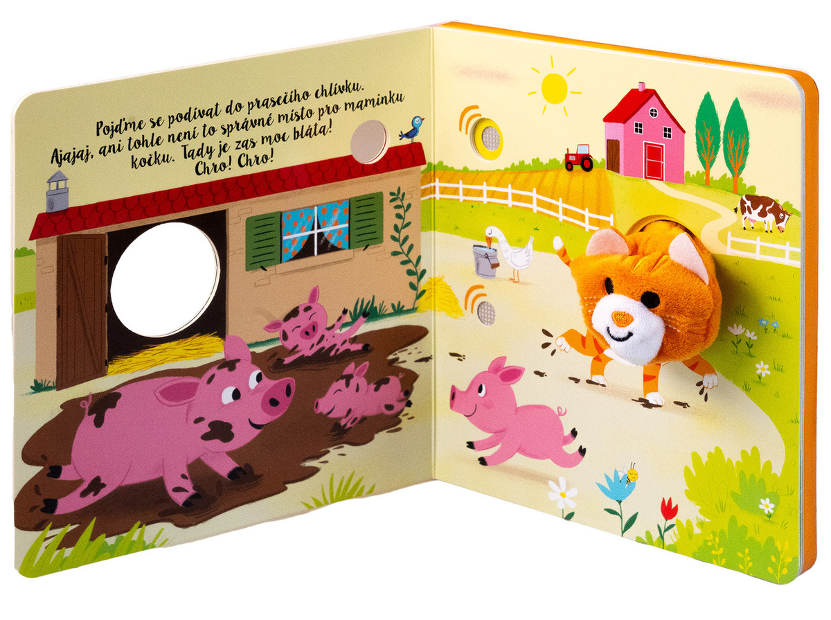 Leporelo s prstovým maňáskem a 6 zvukovými tlačítky. Kampak se poděla maminka malé kočičky? Pojďme ji s kočičkou najít a přitom prozkoumáme celou farmu. Kde může být? Před chlívkem u prasátek, anebo na pastvě s kravičkou? Poslechněte si s vašimi malými farmáři a farmářkami zvuky hospodářských zvířat, doprovázené jemnou hudbou. Vyzkoušejte, co se stane, když stisknete zvukové tlačítko. Kdopak to mňouká? Roztomilý maňásek se může díky prstíkům pohybovat a báječně tak oživuje příběh z farmy.