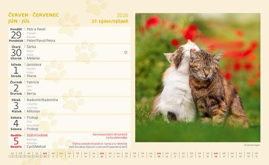 Formát kalendáře: 22,6 x 13,9 cm </br> Kalendárium: české/slovenské týdenní řádkové </br> Počet stran kalendáře: 58 + 2 </br> Stojánek: se zámkem </br> Prostor pro přítisk: 22,6 x 3 cm </br> + 365 kočičích jmen