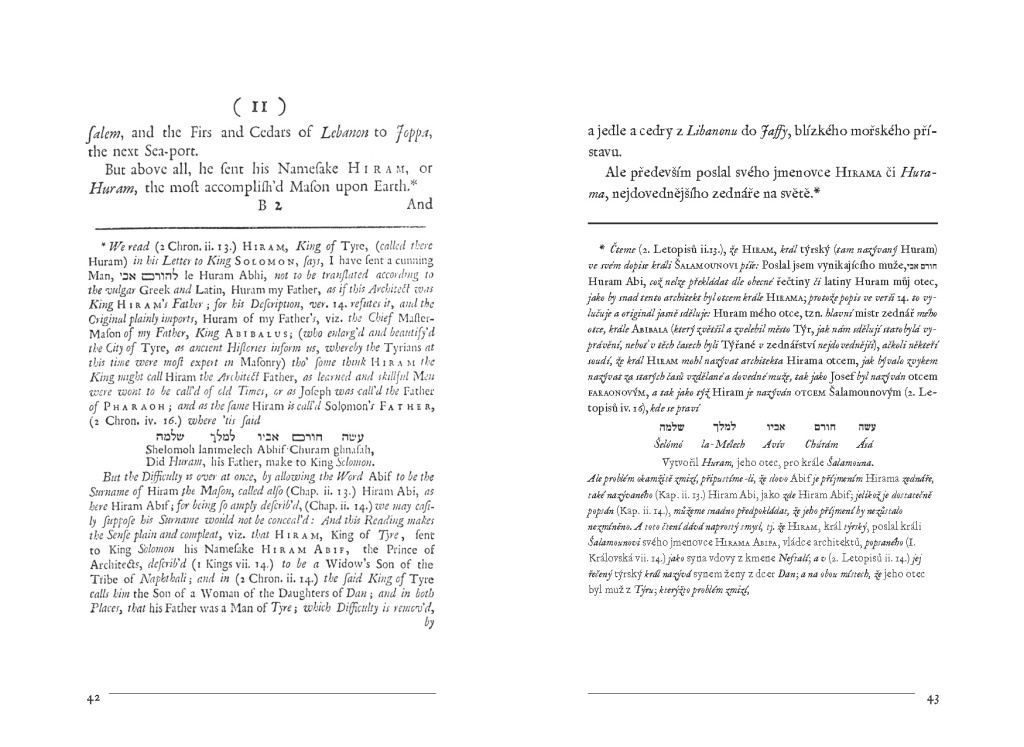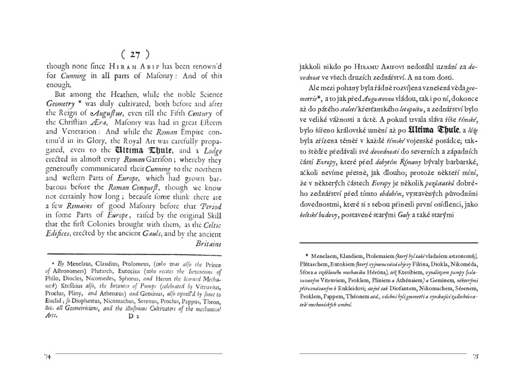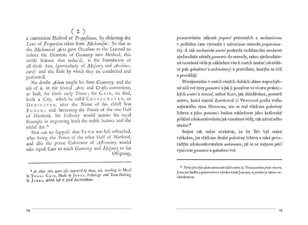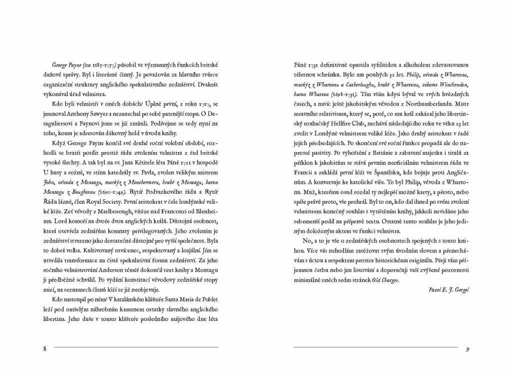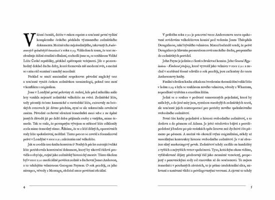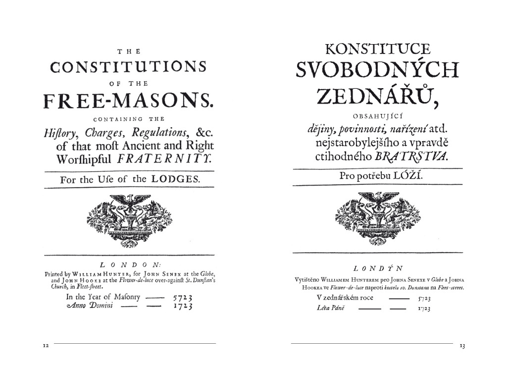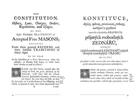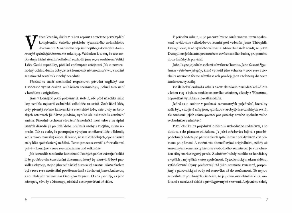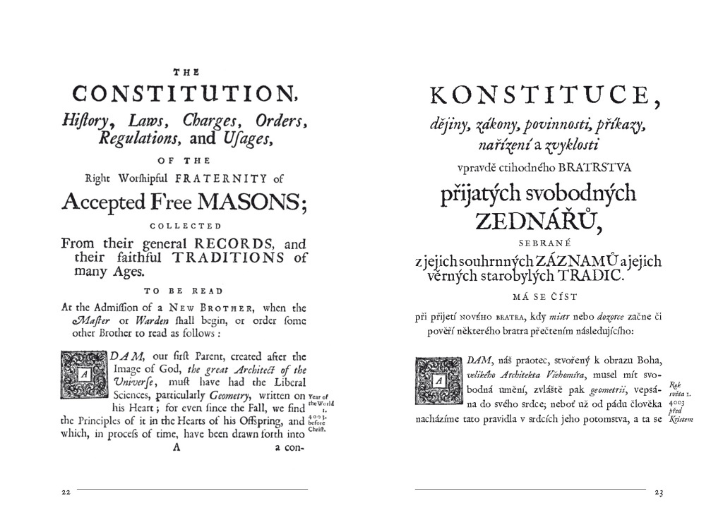 Po více než třech stech letech od své první londýnské publikace vycházejí v češtině poprvé kompletní Andersonovy konstituce z roku 1723. Tento text je považován za naprosto zásadní pro vývoj svobodného zednářství. Překlad zahrnuje nejen Charges a General Regulations, ale také celou historickou kapitolu, stejně jako zednářské písně.