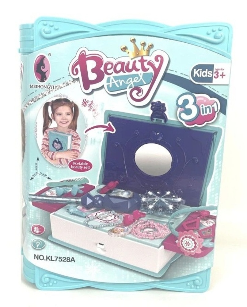"Kouzelný kosmetický stolek pro malé princezny. Součástí doplňky do vlasů, kouzelná hůlka se světelnými a zvukovými efekty. Praktické balení ve tvaru knihy, do kterého lze všechny části složit a vzít na cestu nebo ke kamarádce. Provoz hůlky na 3 knoflíkové baterie typu AG13 - součástí balení."