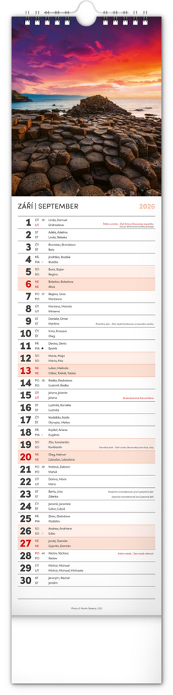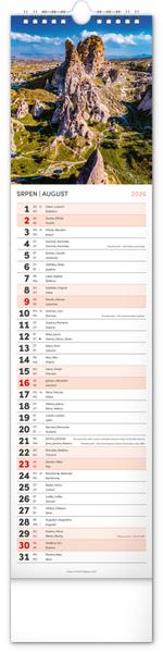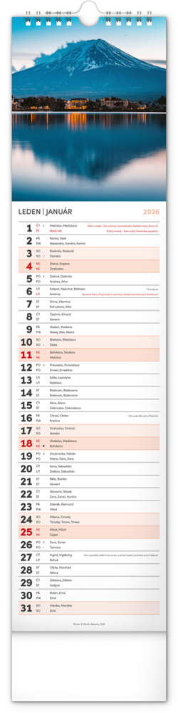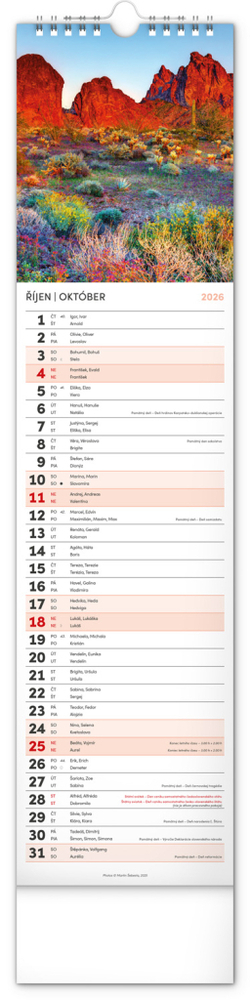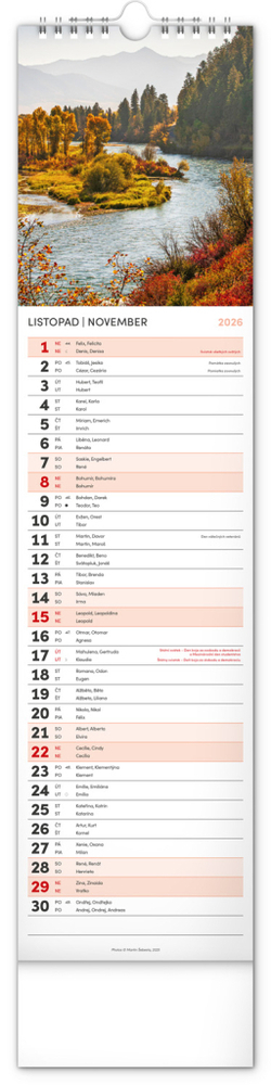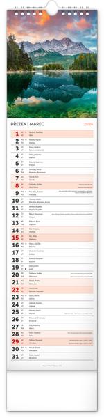 Udělejte si radost pohledem na fotografie malebné krajiny v praktickém úzkém formátu česko-slovenského nástěnného kalendáře. Kalendář obsahuje česká a slovenská jména, svátky, památné dny i měsíční fáze. V každém jednotlivém dni je prostor pro poznámky.
