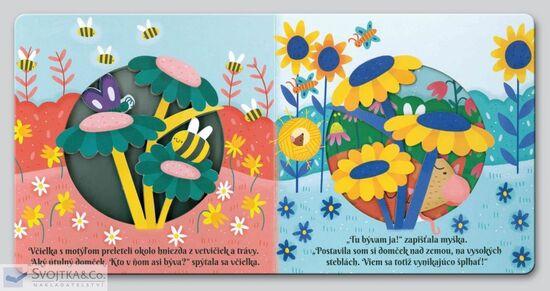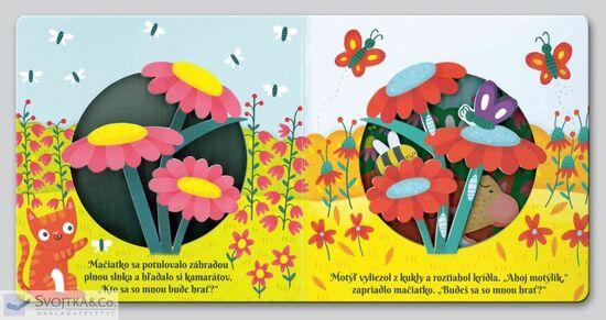 Kto sa hrá na slniečku? Mačička sa potuluje po záhrade a hľadá si kamarátov. Stretáva motýľa aj včeličku, ale obaja majú naponáhlo. Ani myšička, ktorá si postavila domček vo vysokých steblách, nemá na mačiatko čas. Neskôr, keď sa zvieratká chcú s mačiatkom hrať, nemôžu ho nájsť. Och! Ono na slniečku zaspalo! V tejto úchvatnej knižke môžeš doslova nakuknúť do príbehu. Ponúka čarovný, trojrozmerný pohľad do slnečnej letnej prírody v záhrade, kde je poriadne živo. Otáčaj stránky, sleduj príbeh a zoznamuj sa s novými postavami, ktoré sa objavujú. To je krásny letný deň!
