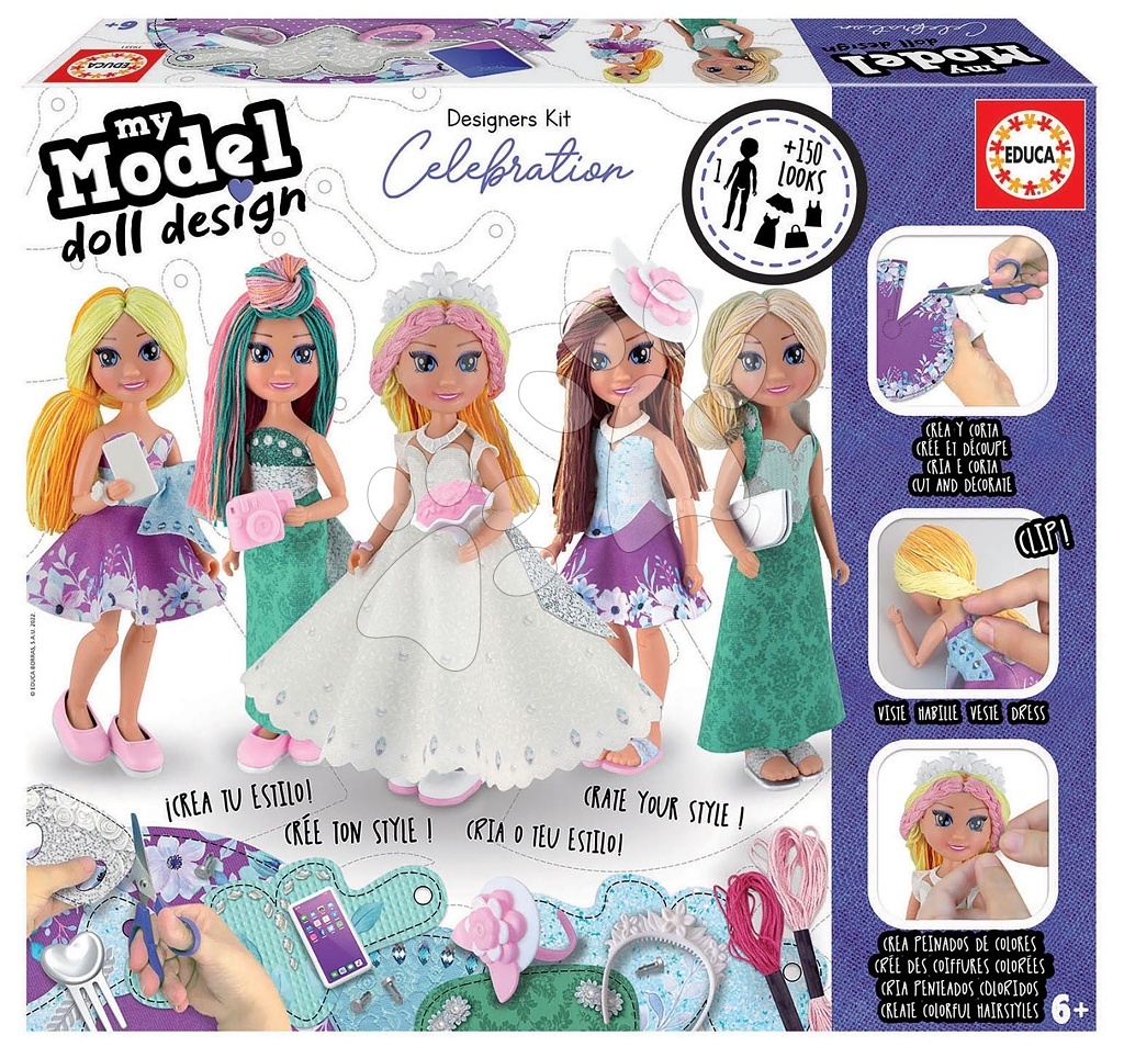 Kreativní tvoření My Model Doll Design Celebration od španělského výrobce Educa potěší všechny děti a zejména holčičky od 6 let. Kreativní sada obsahuje vše potřebné pro výrobu popstar panenky v nádherných šatech – děti najdou v balení 1 panenku a 150 doplňků, se kterými vyzdobí panenku. K dispozici budou mít bavlnu na vlásky, látku s předefinovaným vzorem na vystřihování, klip na šaty a další designové doplňky. Panenka má pohyblivé končetiny, takže děti získají ještě realističtější zážitek při hře na módní návrhářky, inspirovat se mohou obrázkem 5 různých modelů.