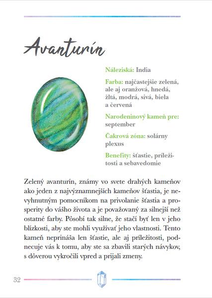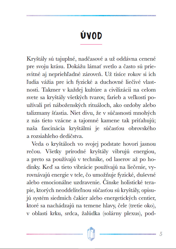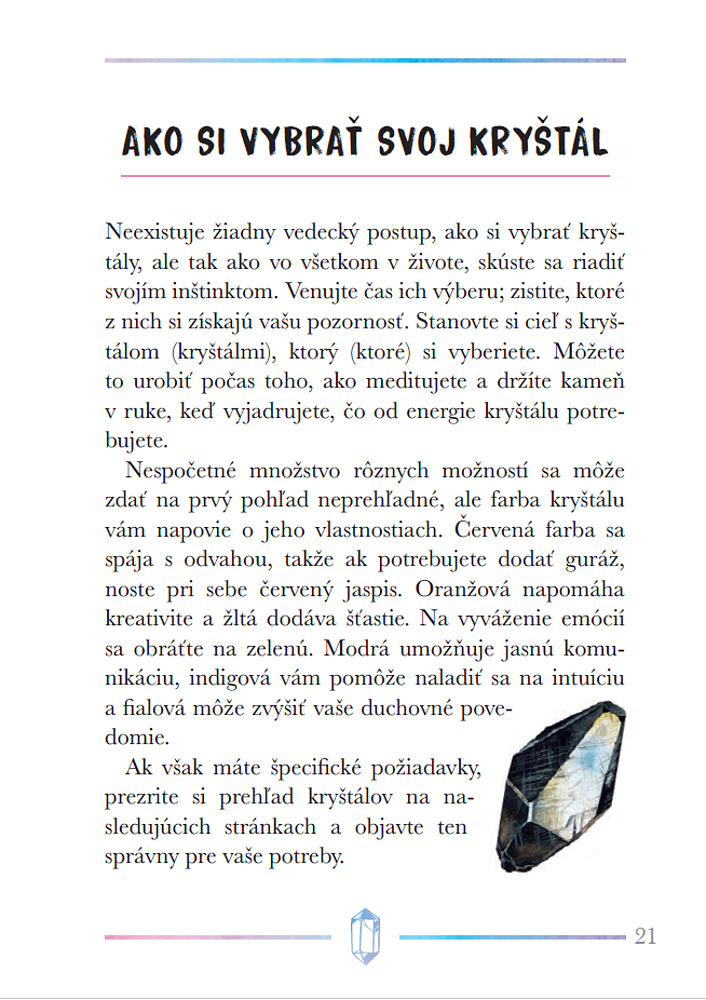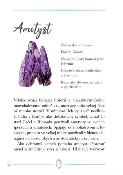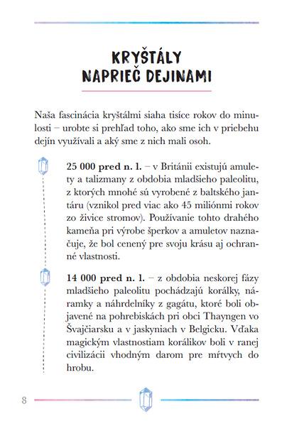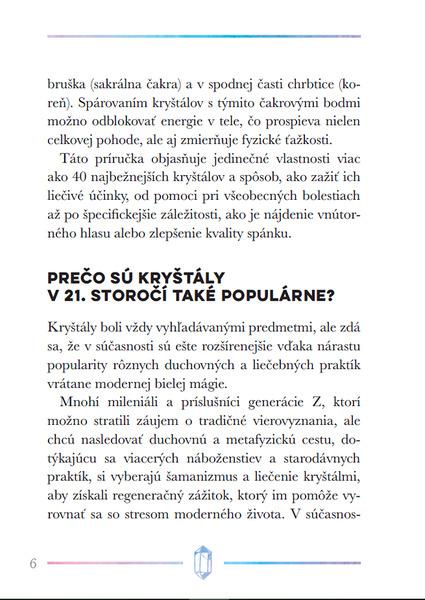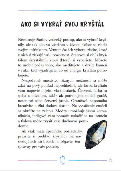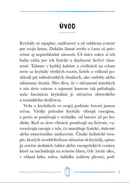 Kryštály a iné kamene sú už tisíce rokov vyhľadávané pre svoju krásu, ale aj pre ich schopnosť liečiť fyzické a duševné ťažkosti. Táto kniha prevedie čitateľov možnosťami ich použitia, naučí ich, ako si vybrať najvhodnejšie kamene pre seba, ako sa o ne starať, a tiež ich zoznámi so základnými technikami kryštálovej meditácie a liečenia čakier. Obsahuje stručné profily viac ako 40 najdôležitejších kameňov, ktoré môžu do nášho života priniesť viac harmónie, relaxácie a pozitívnej energie.