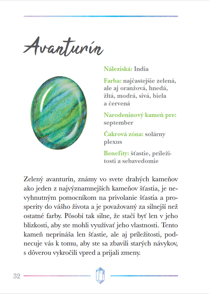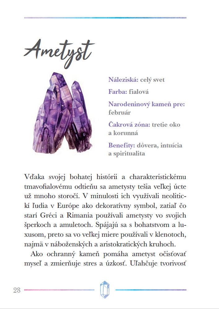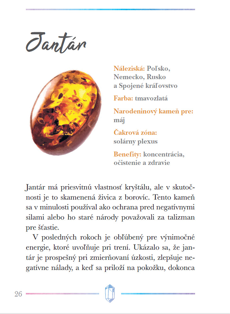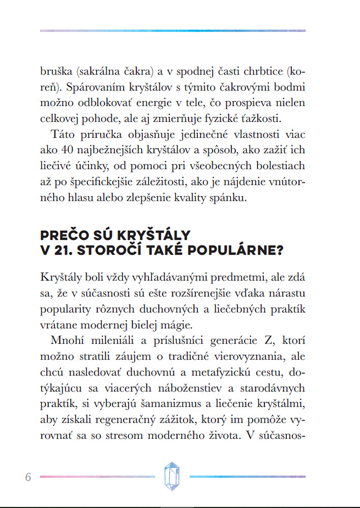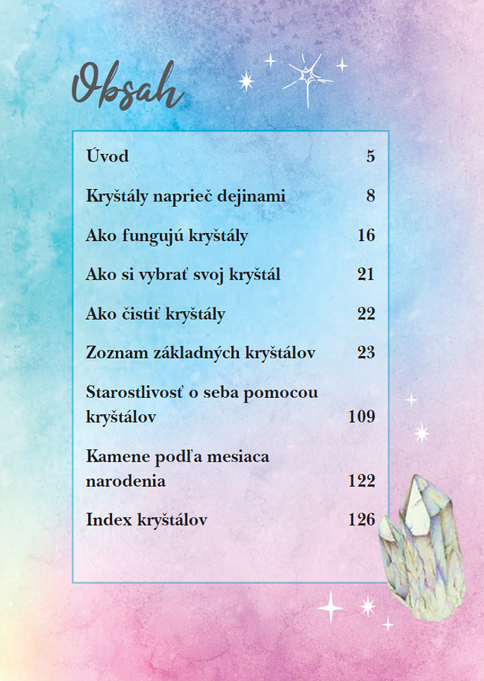 Kryštály a iné kamene sú už tisíce rokov vyhľadávané pre svoju krásu, ale aj pre ich schopnosť liečiť fyzické a duševné ťažkosti. Táto kniha prevedie čitateľov možnosťami ich použitia, naučí ich, ako si vybrať najvhodnejšie kamene pre seba, ako sa o ne starať, a tiež ich zoznámi so základnými technikami kryštálovej meditácie a liečenia čakier. Obsahuje stručné profily viac ako 40 najdôležitejších kameňov, ktoré môžu do nášho života priniesť viac harmónie, relaxácie a pozitívnej energie.