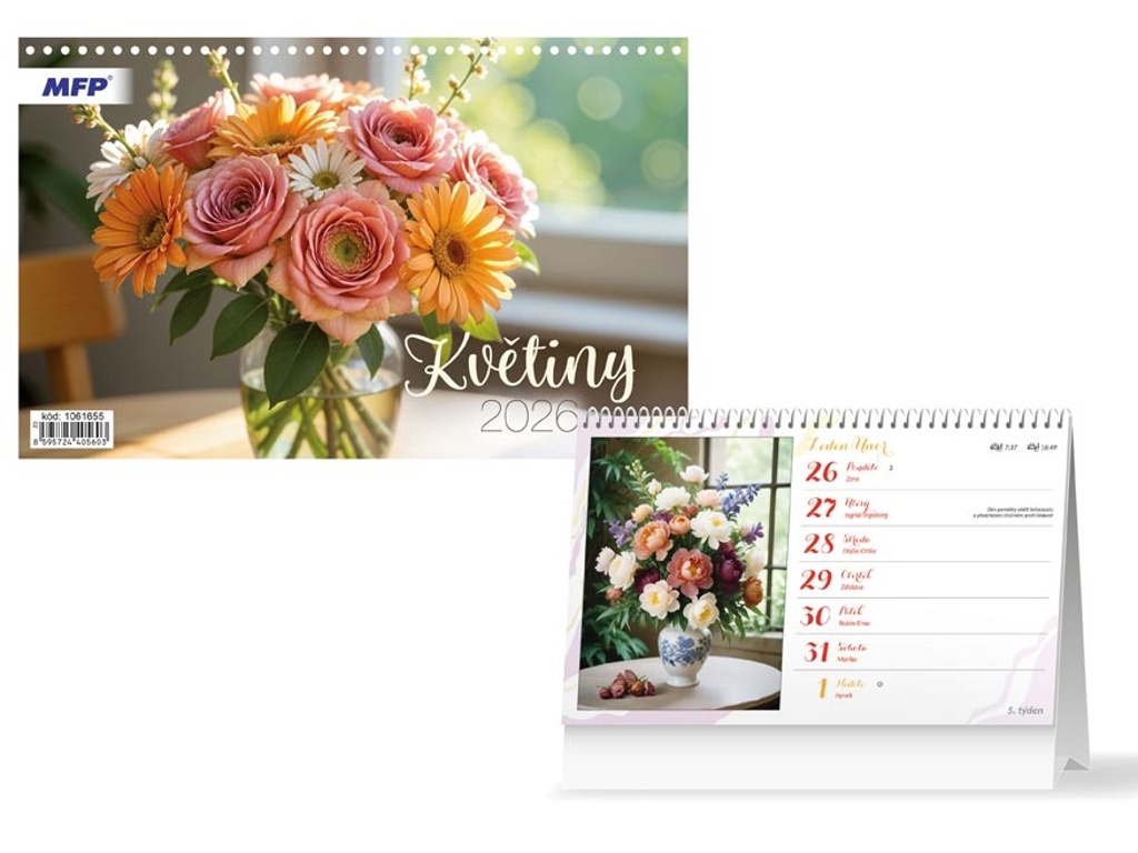 Stolní kalendář na rok 2026 s názvem Květiny. Kochejte se fotkami krásných květinových vazeb a inspirujte se. Vhodný k organizování různých událostí každodenního života. Možnost dotisku firemního loga a textu na spodní stranu kalendáře.