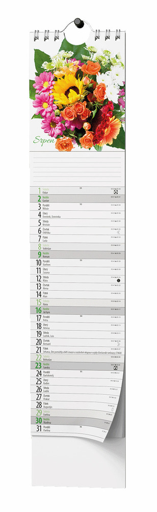 Netradiční nástěnný kalendář ve formátu kravaty s působivými obrázky kytic.