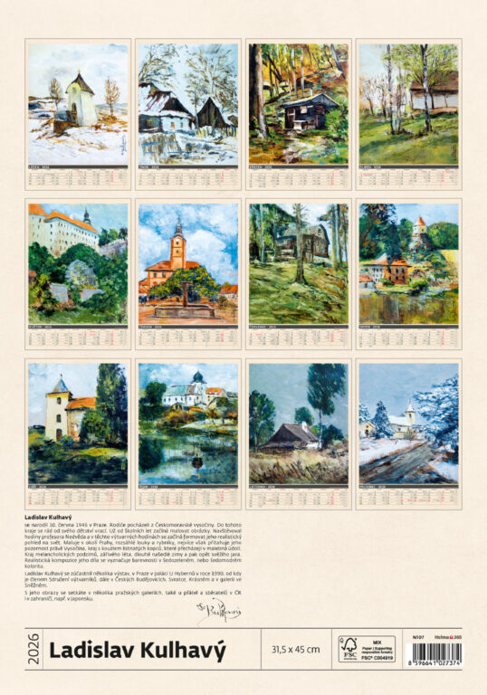 Formát kalendáře: 31,5 x 45 cm </br> Kalendárium: české měsíční jmenné </br> Rozsah kalendáře: 14 listů </br> Vazba: Twin-wire (se spirálou) </br> Prostor pro přítisk: 31,5 x 7 cm </br> Autor: Ladislav Kulhavý