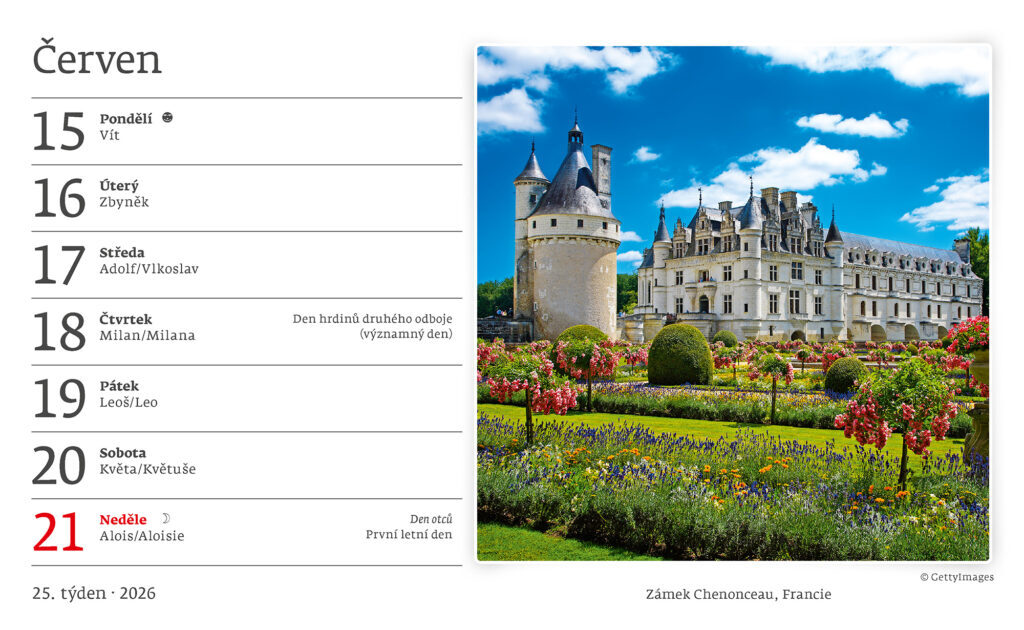 Formát kalendáře: 22,6 x 13,9 cm Kalendárium: české týdenní řádkové Počet stran kalendáře: 58 + 2 Stojánek: se zámkem Prostor pro přítisk: 22,6 x 3 cm