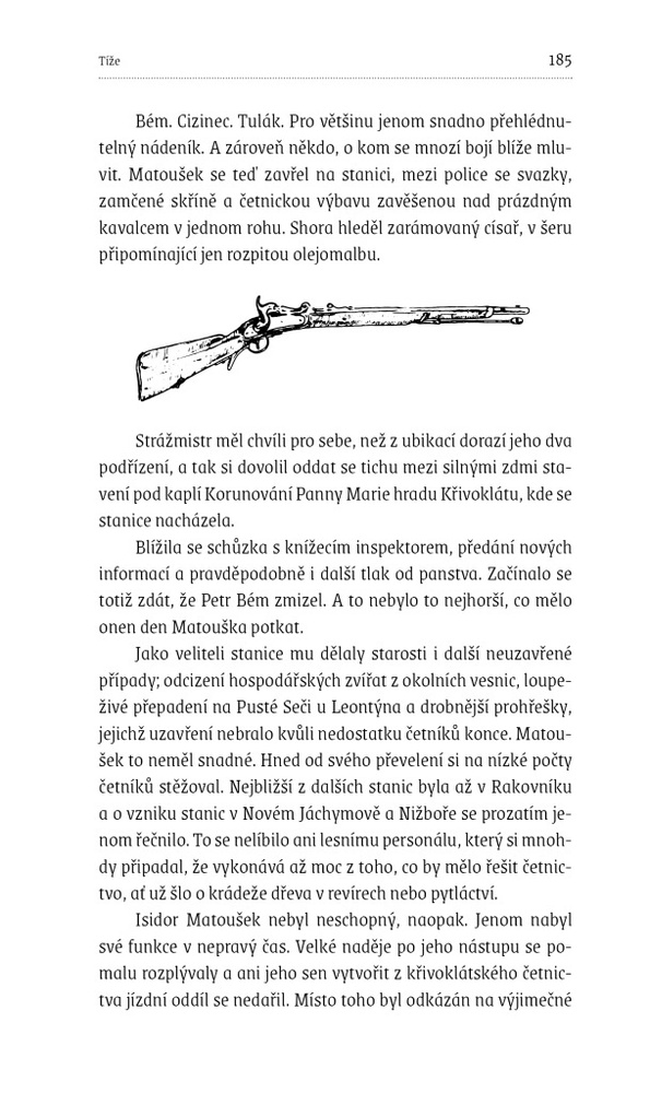 Dramatická sonda do křivoklátského venkova druhé poloviny 19. století. Románově zpracovaná kniha letmo navazuje na části úspěšné autorovy fotoknihy „Křivoklátsko – cesta do duše krajiny“. Je inspirována jak skutečnými střety mezi pytláky a lesním personálem, tak životem uhlířů a proměnou venkovské společnosti v době před velkou hospodářskou krizí v roce 1873. Syrově zachycený děj, vzdávající hold zapomenutým časům a řemeslům, se z velké části drží faktických historických souvislostí. Zavádí čtenáře do lesů v okolí Karlovy Vsi, Broum, Nového Jáchymova, Roztok, Křivoklátu, Skryjí nebo na hrad Týřov a skalnaté svahy nad Úpořským údolím. Některé lokace zůstaly dodnes téměř stejné, jiné v tehdejší podobě zanikly, ale příběh je nechává znovu oživnout.