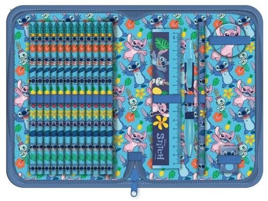 Penál s motivem populární postavičky Stitch z Disneyho filmu Lilo a Stitch je navržen v jasně modré barvě, která dominuje celému designu. Na přední straně penálu je vyobrazena roztomilá postavička Stitch sedící s výrazem zvědavosti, doplněná o barevné květiny a listy, které umocňují tropickou atmosféru. Kolem okrajů je penál lemován modrým zipem, který uzavírá celý obsah a zajišťuje jeho bezpečné uložení.