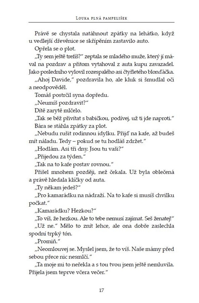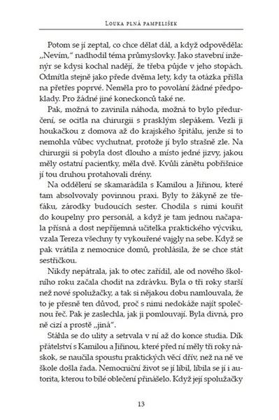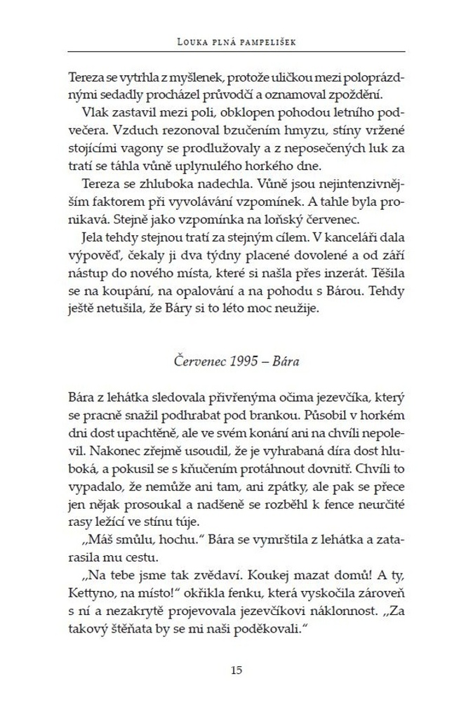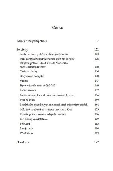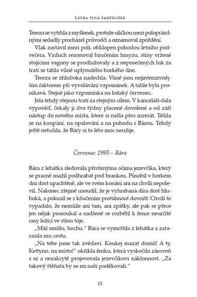 Novela Louka plná pampelišek vyšla jako příloha časopisu a pak zapadla na dno šuplíku. Je na čase ji oprášit a udělat radost nejen fanouškům oblíbené spisovatelky. Tereza přijíždí do malé vesničky v Podkrkonoší, aby u kamarádky z gymnázia našla dočasné útočiště. Utíká před problémy, které jí ...