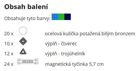 Stavebnice Kids Panels 68 obsahuje celkem dvacetčtyři stříbrných tyček v délce 5,7 cm, dvacet kuliček, dvanáct plastových výplní trojuhelníků zelených, deset čtvercových výplní světle modrých a a dvě výplně pětiúhelníkové tmavě modré. Stavebnice je určena pro děti od 3 let.