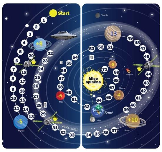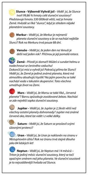 Výhercem se stává hráč, který jako první přistane na Slunci. Hráči se navíc dozví zajímavosti o jednotlivých planetách v naší Sluneční soustavě. Věk: 5+. Počet hráčů: 2-4.