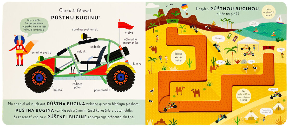Vydaj sa za dobrodružstvom s púštnou buginou, v ponorke či v raketopláne. Zisti o vozidlách a strojoch veľa zaujímavostí a pomocou popisov pri každom z nich sa dozvieš, z čoho sa skladajú. Potom sa s posuvnými kolieskami môžeš prejsť po trasách a užiť si poriadnu zábavu. Ako vznikla púštna bugina? Čo nevyhnutne potrebuje ponorka? A ako vzniklo slovo astronaut? To a veľa ďalšieho sa dozvieš v tomto hravom, ale aj veľmi poučnom leporele s posuvnými kolieskami.