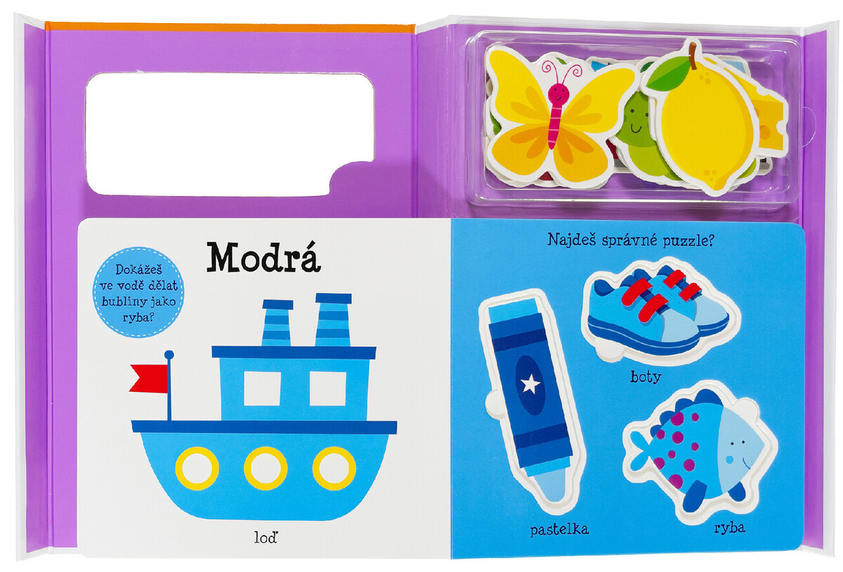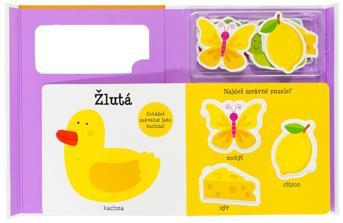 Dokážeš zandat všechna puzzle na ta správná místa a dokážeš všechny tyto předměty i pojmenovat? Tato vesele ilustrovaná knížka nejmenší děti seznámí jak se světem barev, tak i se zvířátky, jídlem či například dopravními prostředky. Kromě puzzle, díky kterým děti budou rozvíjet a trénovat jemnou motoriku, na malé zvědavce čekají i otázky a úkoly, které jim pomohou si nové znalosti a již nabyté vědomosti procvičit a lépe si je tak osvojit. S knížkou i puzzle se vaše děti rozhodně nudit nebudou a stráví s nimi celé hodiny hraní a učení.