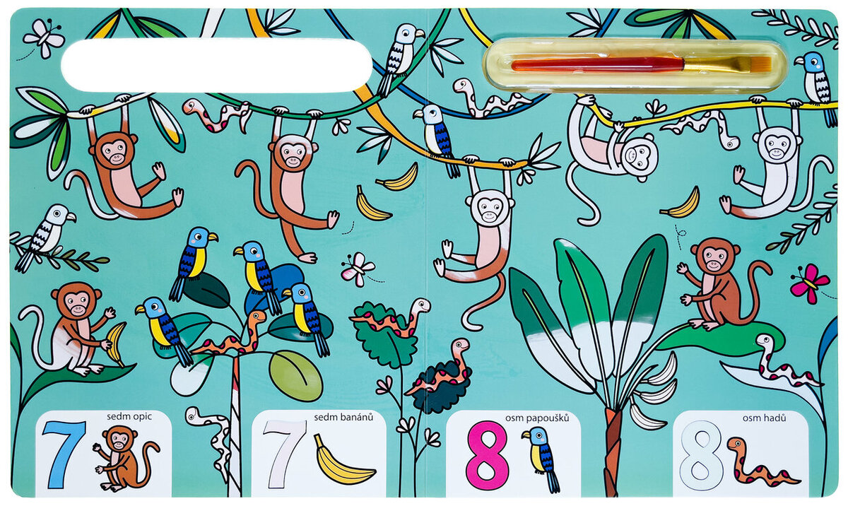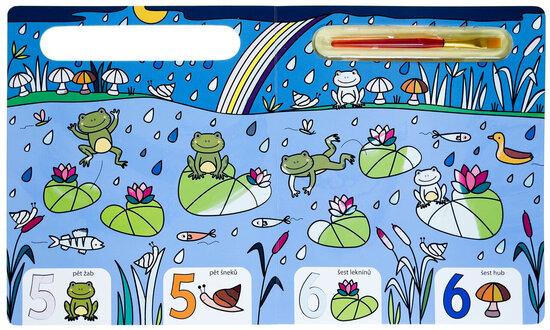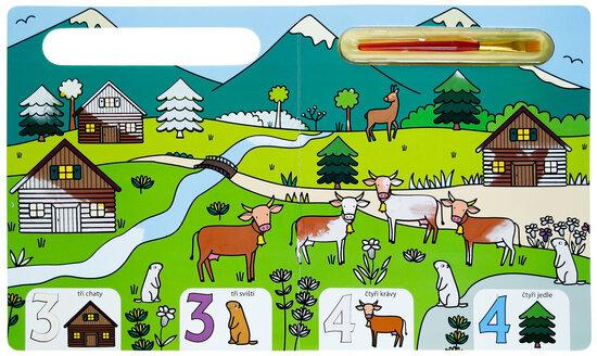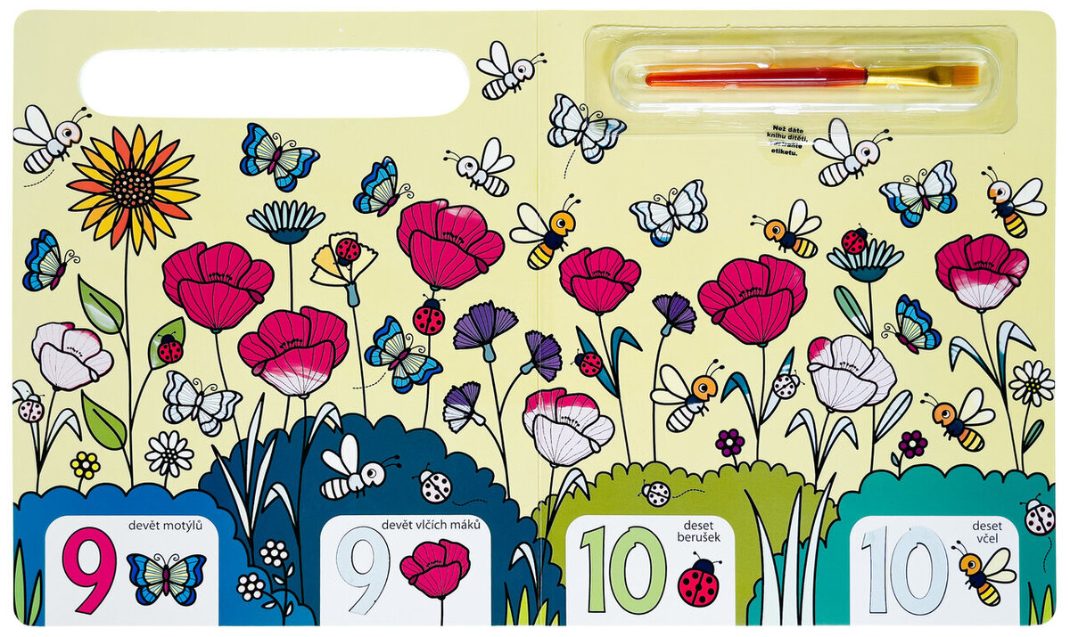 Knížka s pevnými stránkami je plná obrázků z přírody, které jsou částečně barevné. Bílé části lze velice snadno vybarvit - stačí namočit štětec, který je součástí knihy, do vody a barva se jako zázrakem na bílém podkladě objeví. To ale není všechno! Vymalovaný obrázek jako kouzlem zmizí, a tak jej dítě může vymalovávat stále dokola. Zkontrolujte, zda dítě drží štětec správně. Současně si dítě může osvojit poznávání čísel od 1 do 10 a obrázky hledat i spočítat! S touto knížkou si bude procvičovat jemné motorické schopnosti, koordinaci oka a ruky a základy počítání.