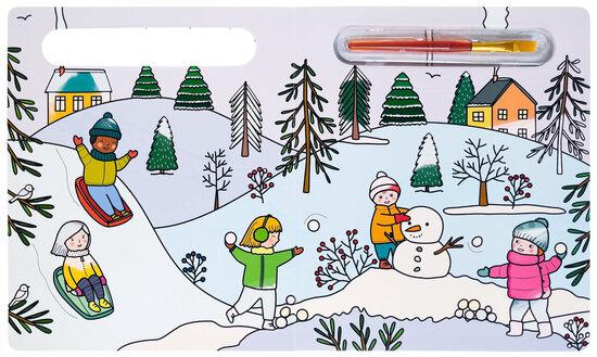 Knížka s pevnými stránkami je plná obrázků s tématem zimy, které jsou částečně barevné. Bílé části lze velice snadno vybarvit - stačí namočit štětec, který je součástí knihy, do vody a barva se jako zázrakem na bílém podkladě objeví. To ale není všechno! Vymalovaný obrázek jako kouzlem zmizí, a tak ...